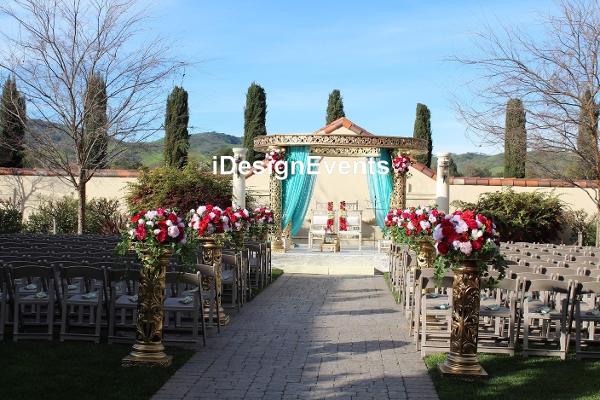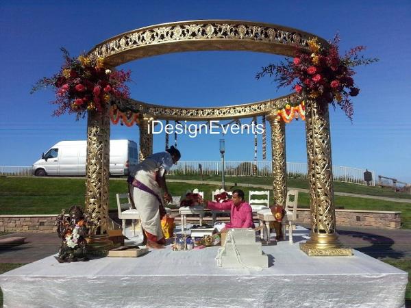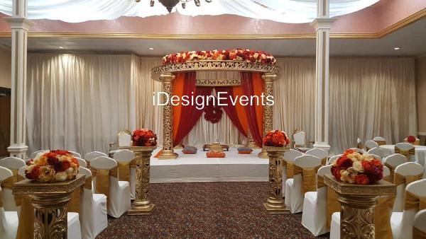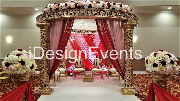 The Gold Mandap sits at under 10 Feet Tall which is ideal for indoor events due to ceiling height limitations for many indoor vendor locations.