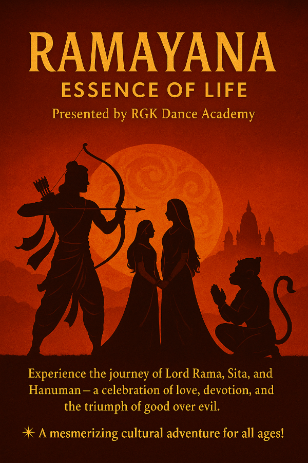 RGK Dance Academy brings the timeless epic of Ramayana alive through dazzling Bollywood dance, drama, and live music. Experience the journey of Lord Rama, Sita, and Hanuman -- a celebration of love, devotion, and the triumph of good over evil.