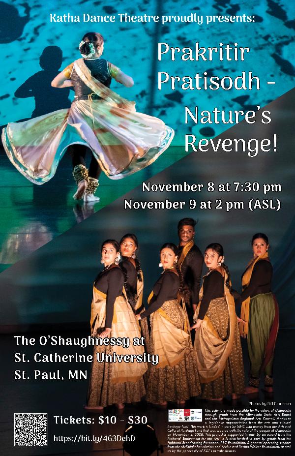 Katha Dance Theatre (KDT) is excited to bring the local premiere of Prakritir Pratisodh - Nature's Revenge! to the O'Shaughnessy at St. Catherine University on November 8 - 9, 2025. This performance marks the Minnesota debut of the evening-length show, which expands upon the original concept that took the stage as a work-in-progress at the Cowles Center's Fall Forward Festival in 2023.
