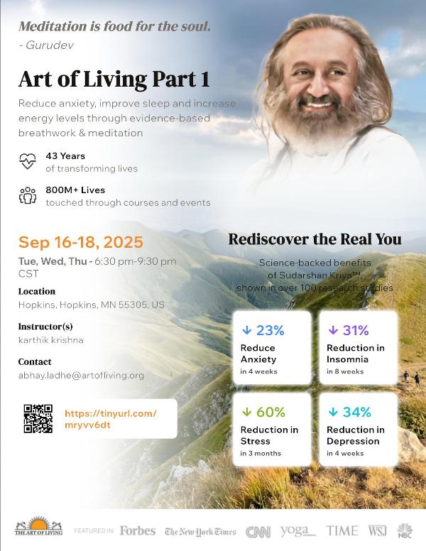 This is a rare opportunity to learn directly from a teacher with extensive experience and a deep connection to Gurudev's teachings. Karthik will be teaching Sudarshan Kriya, a powerful breathwork technique that is a cornerstone of the Art of Living's curriculum. This scientifically-backed practice is renowned for its ability to reduce anxiety, improve sleep, and foster a deep sense of calm and well-being.